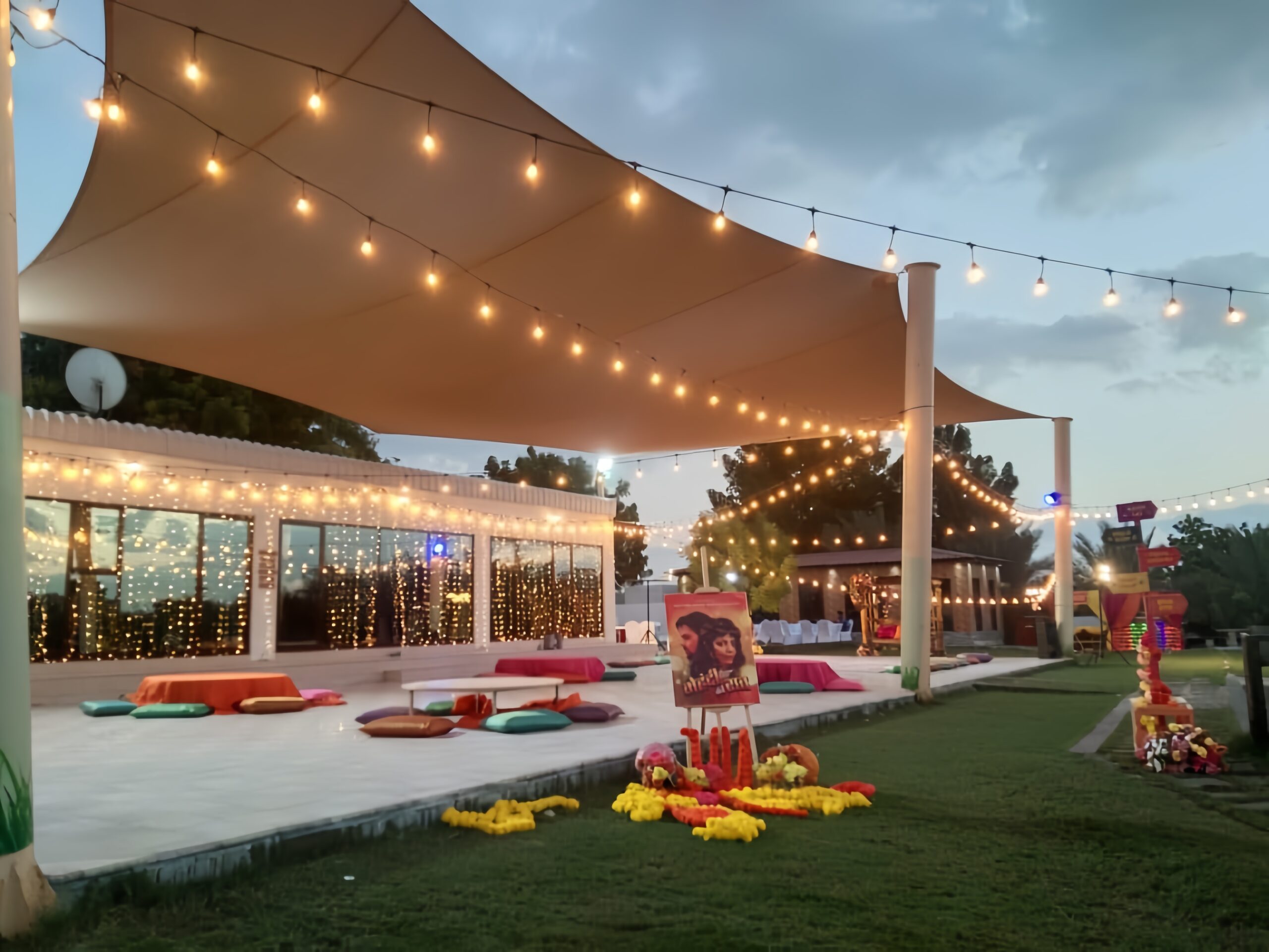 Outdoor event, Canopy, String lights, Festoon lighting, Event venue, Wedding decor, Party setup, Floor seating, Cushions, Celebrations, Garden party, Fairy lights, Ambience, Decorated space, Event design